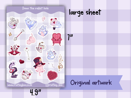 Down the rabbit hole Sticker sheet, gifts for book lovers, Alices adventures in wonderland theme, cute and spooky bookish gift, book club