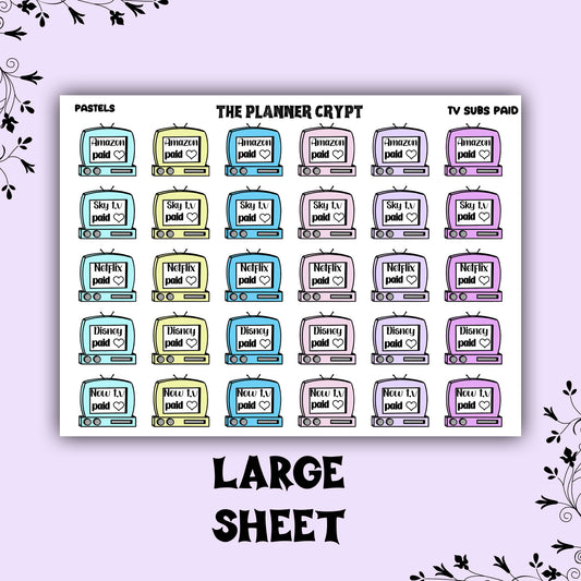 T.v subscriptions paid stickers, paid bill stickers, planner sticker, pastel,goth,vertical planner, small journal, functional sticker,