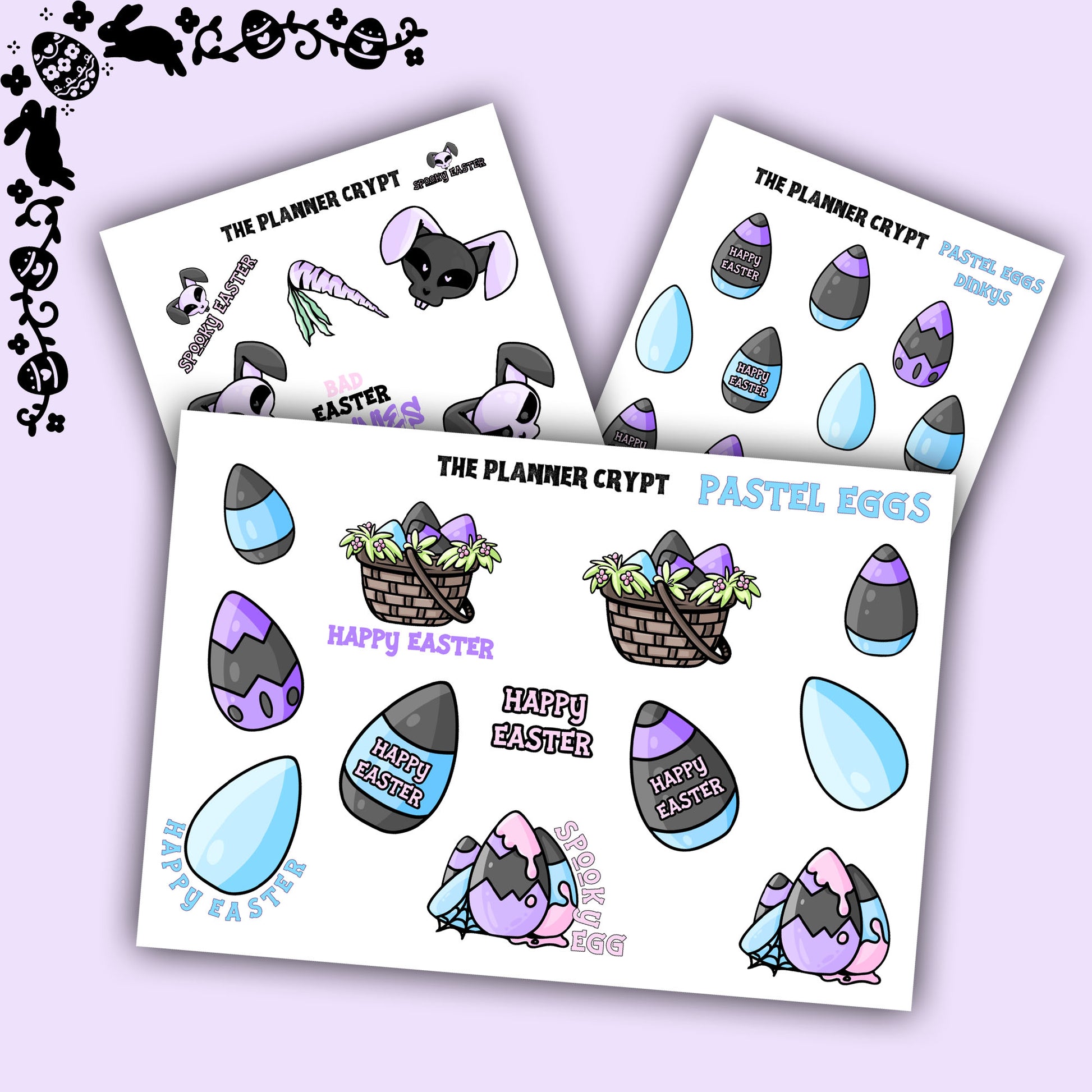 easter stickers, planner stickers, pastel goth, vertical planner, small journal, cute stickers, functional sticker, spooky bunny, goth egg