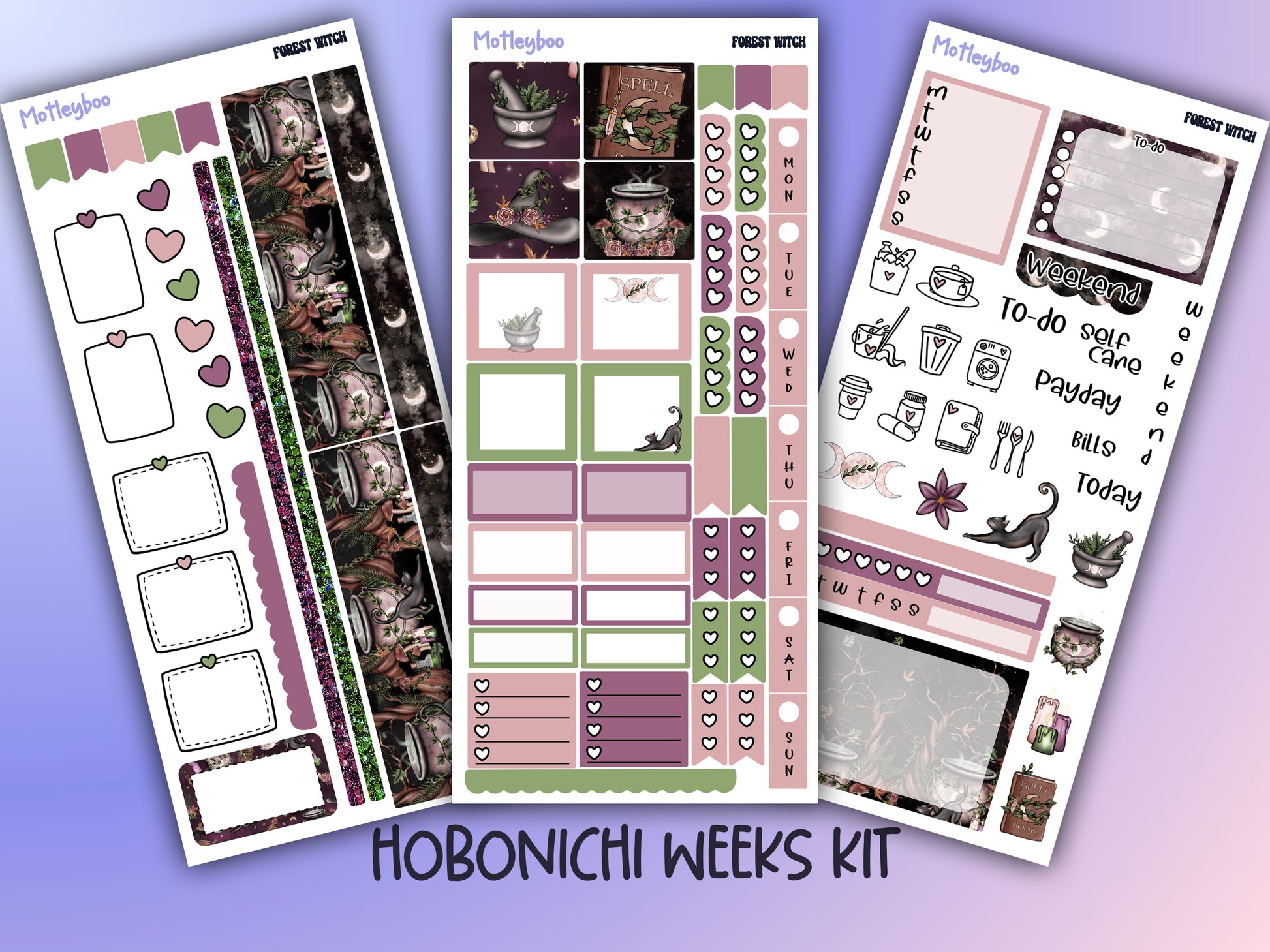 Hobonichi weeks, weekly sticker kit, witch stickers, celestial stickers, mystical stickers, witchcraft stickers, witch vibes, forest witch