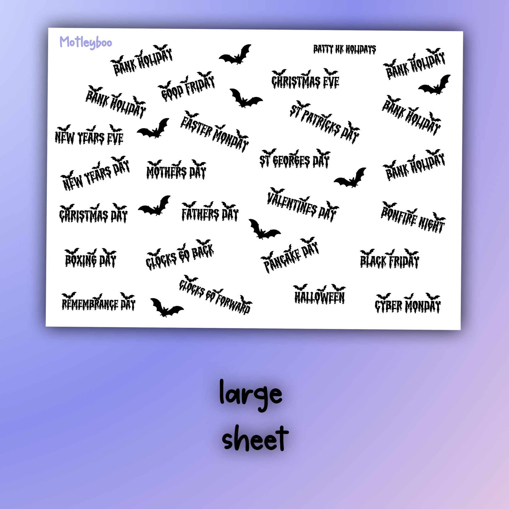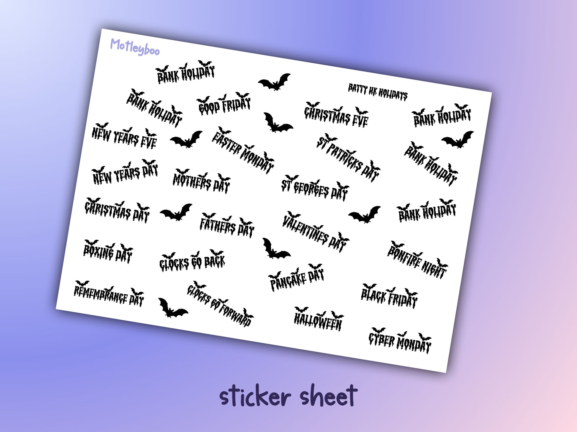 sticker sheet with uk holidays and extra black bat stickers